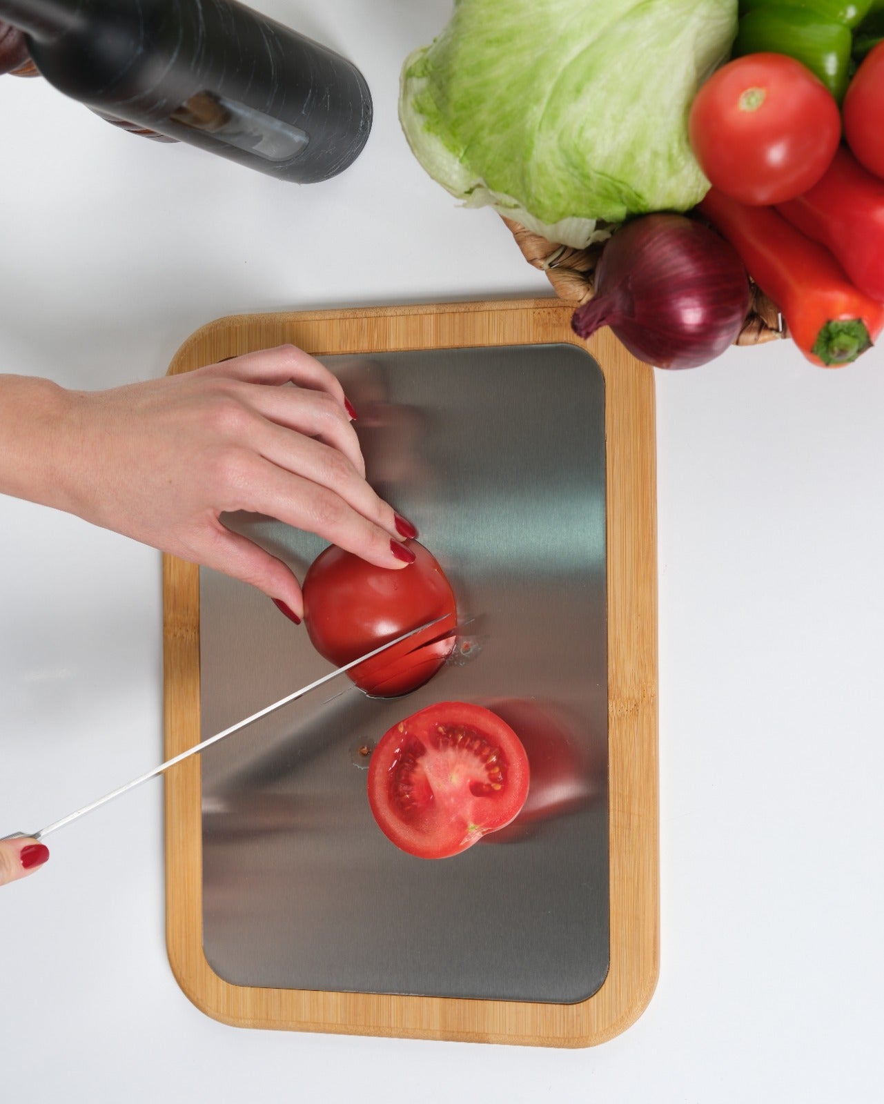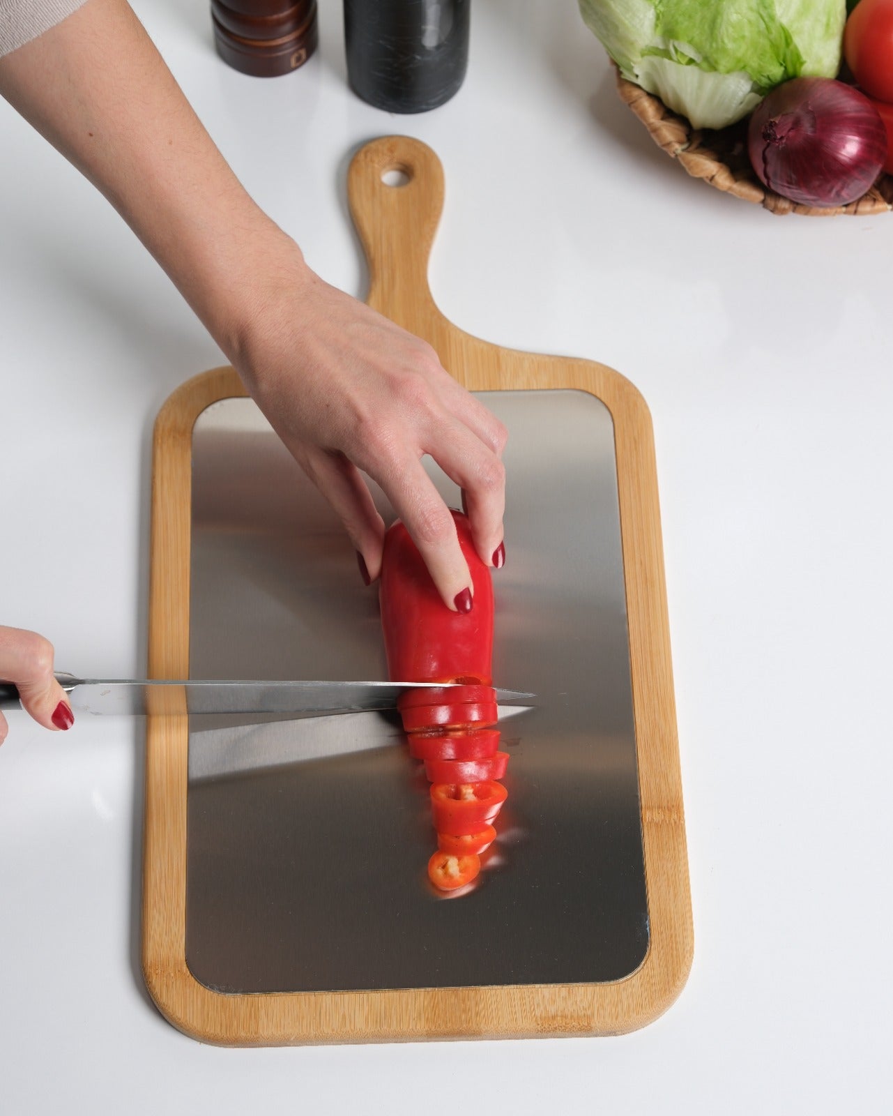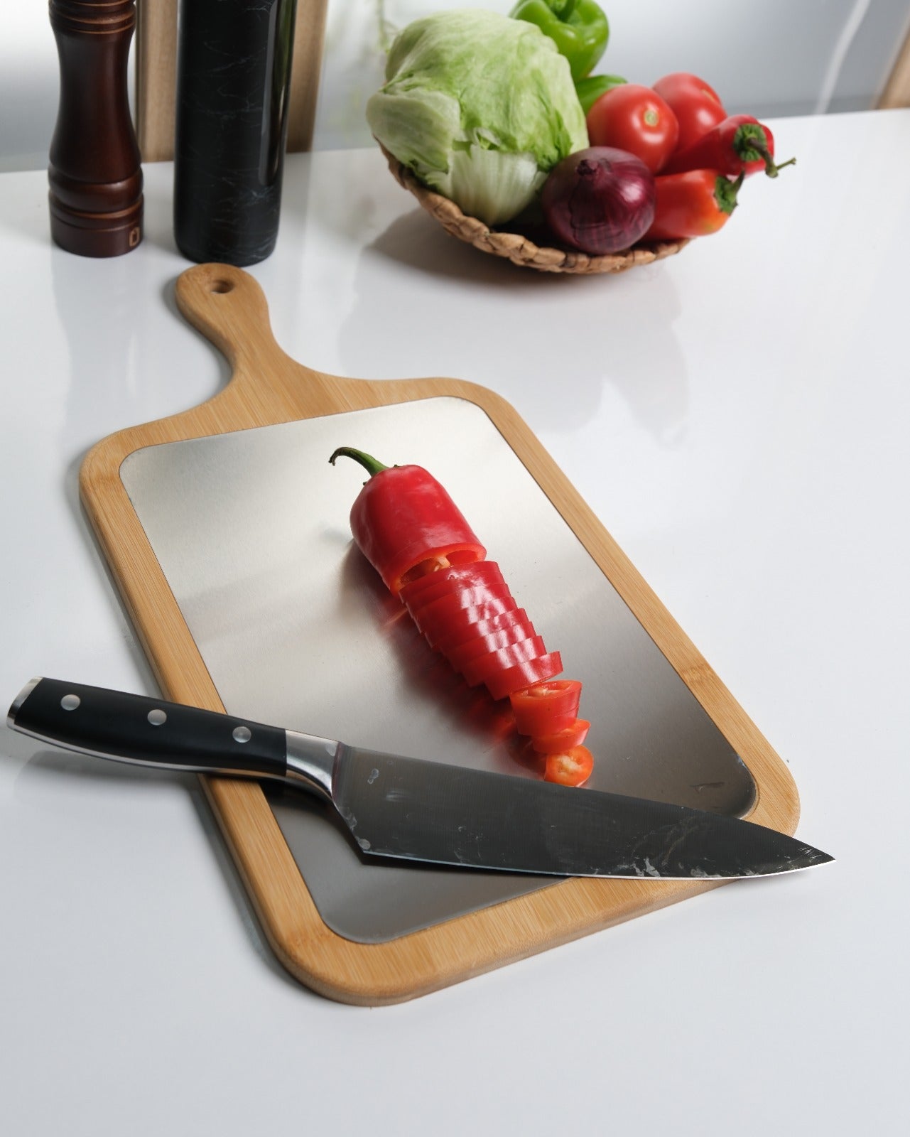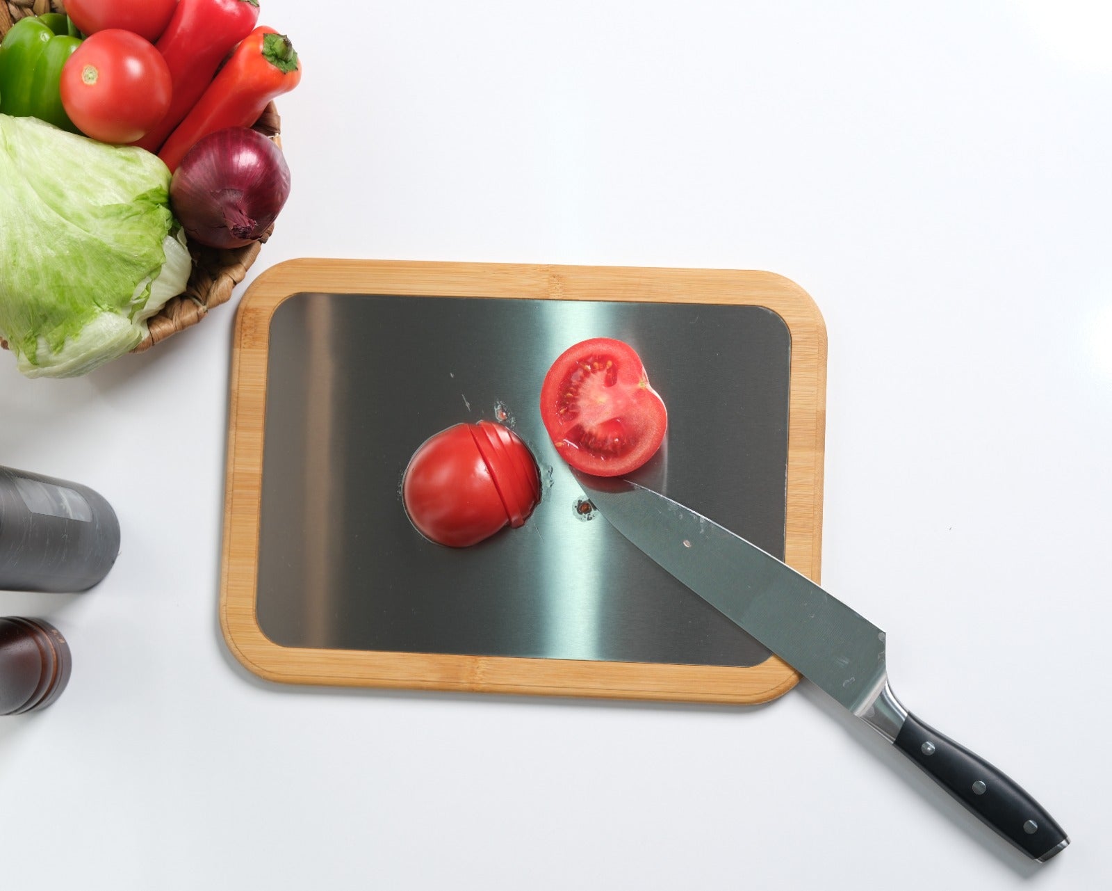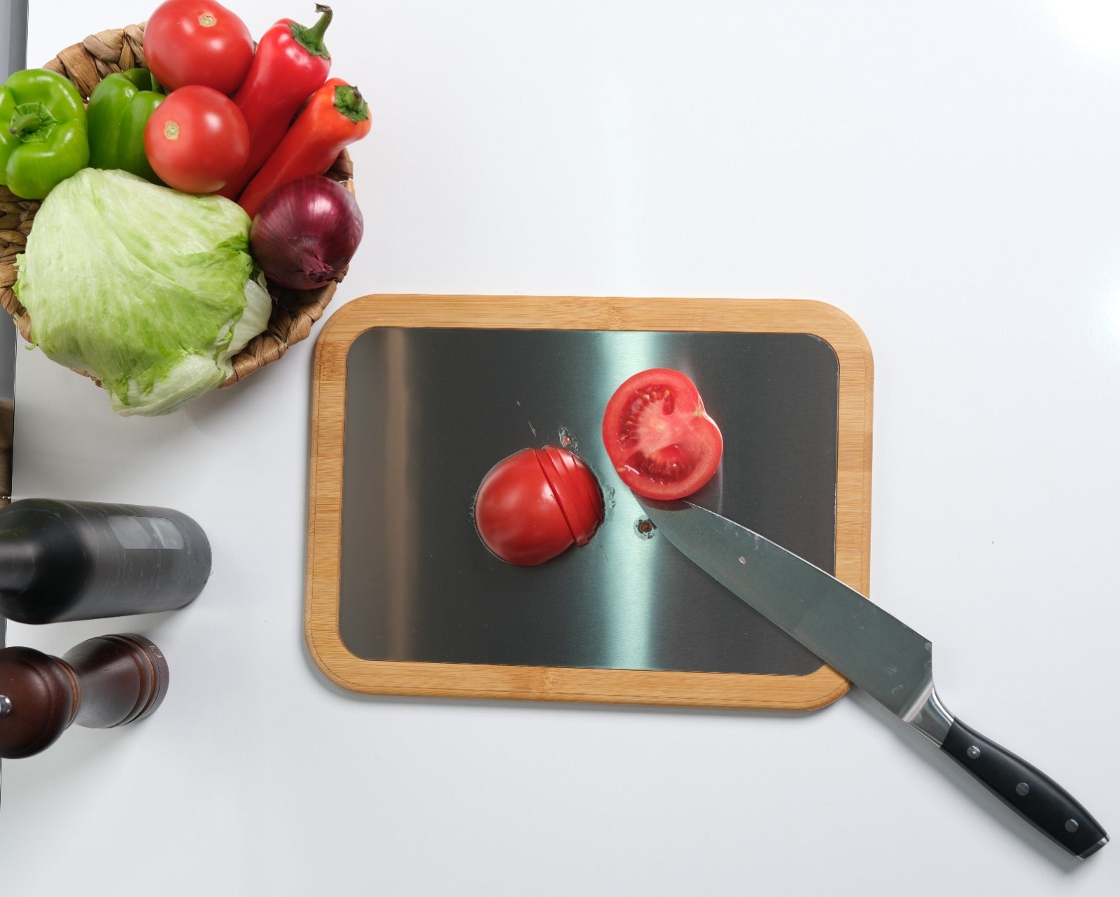 Plastik tahtaları tamamen bıraktım. Metal yüzeyi çok hijyenik, bambu tarafı da harika görünüyor. Gerçekten mutfağımın havası değişti!
